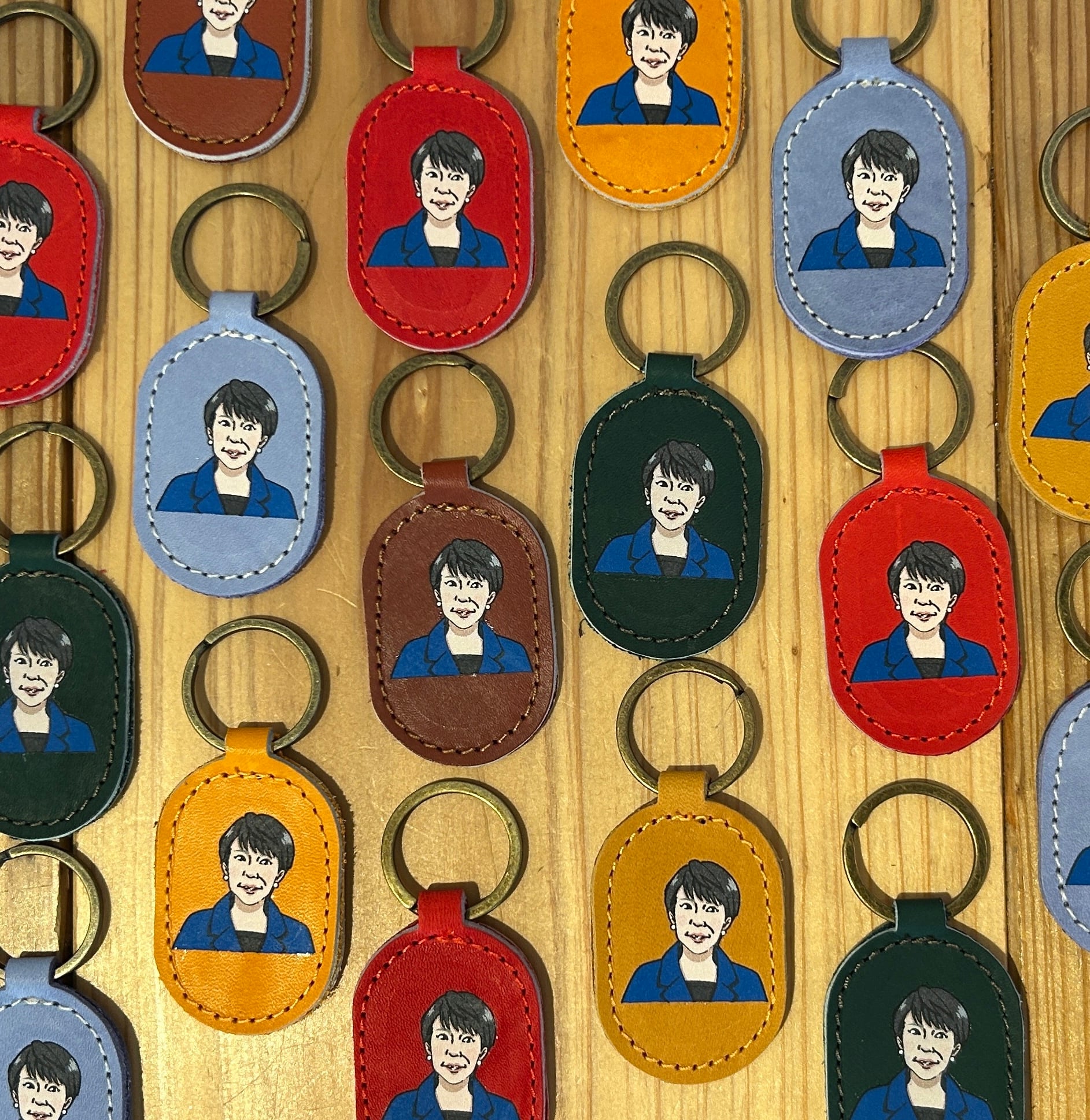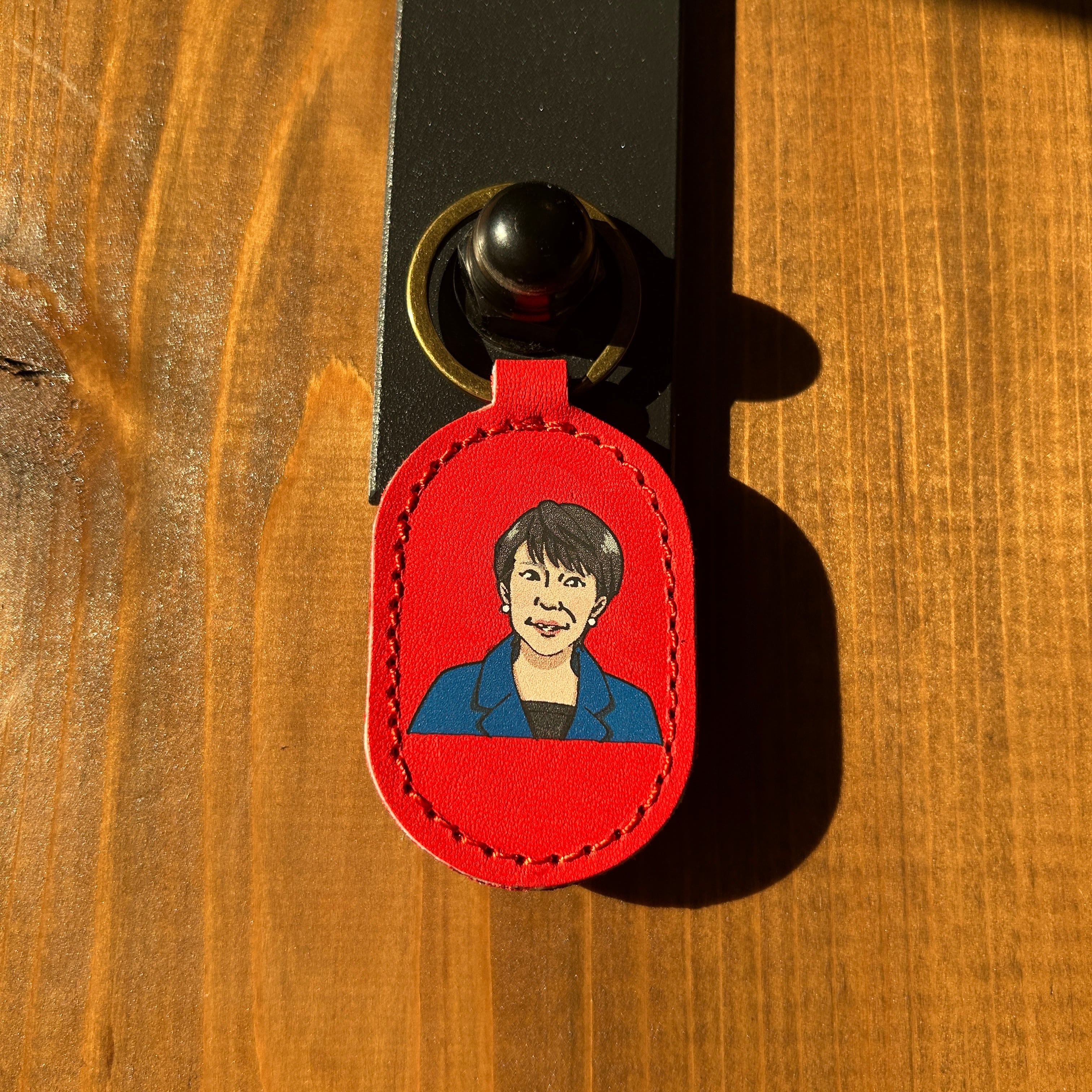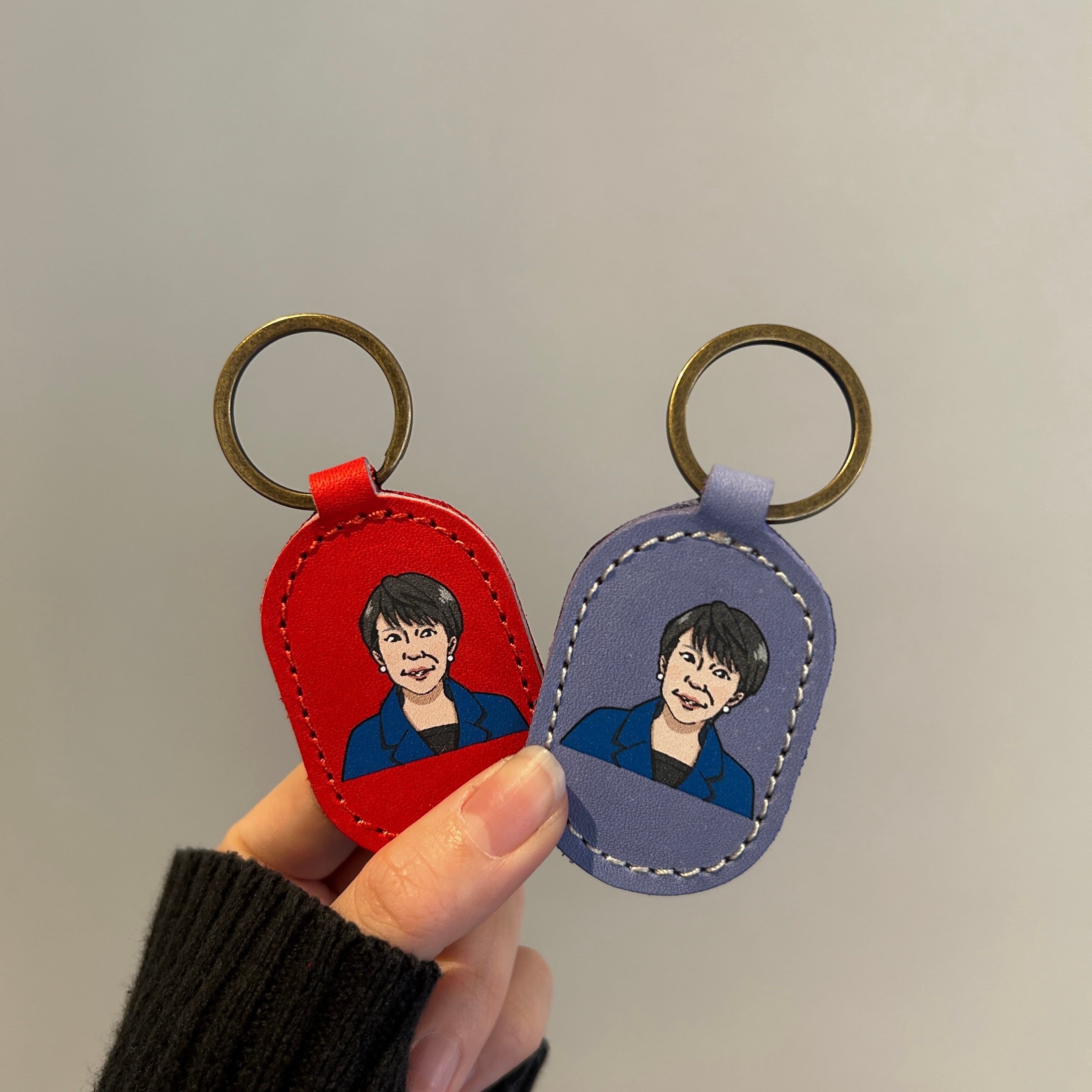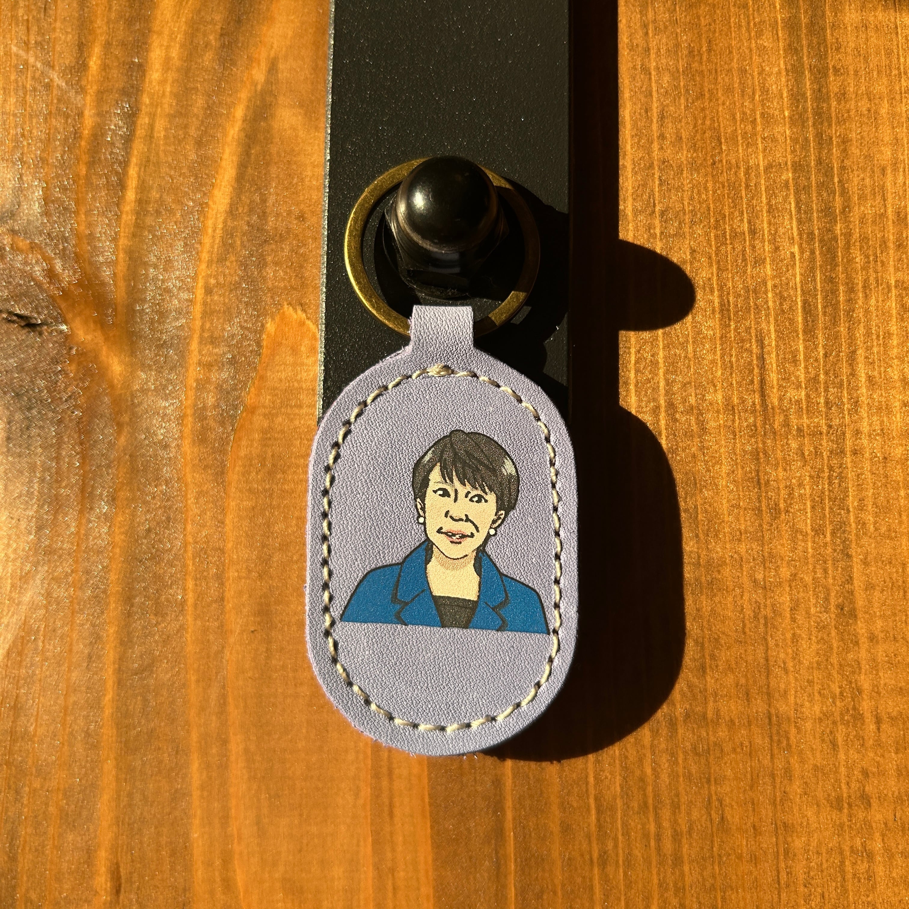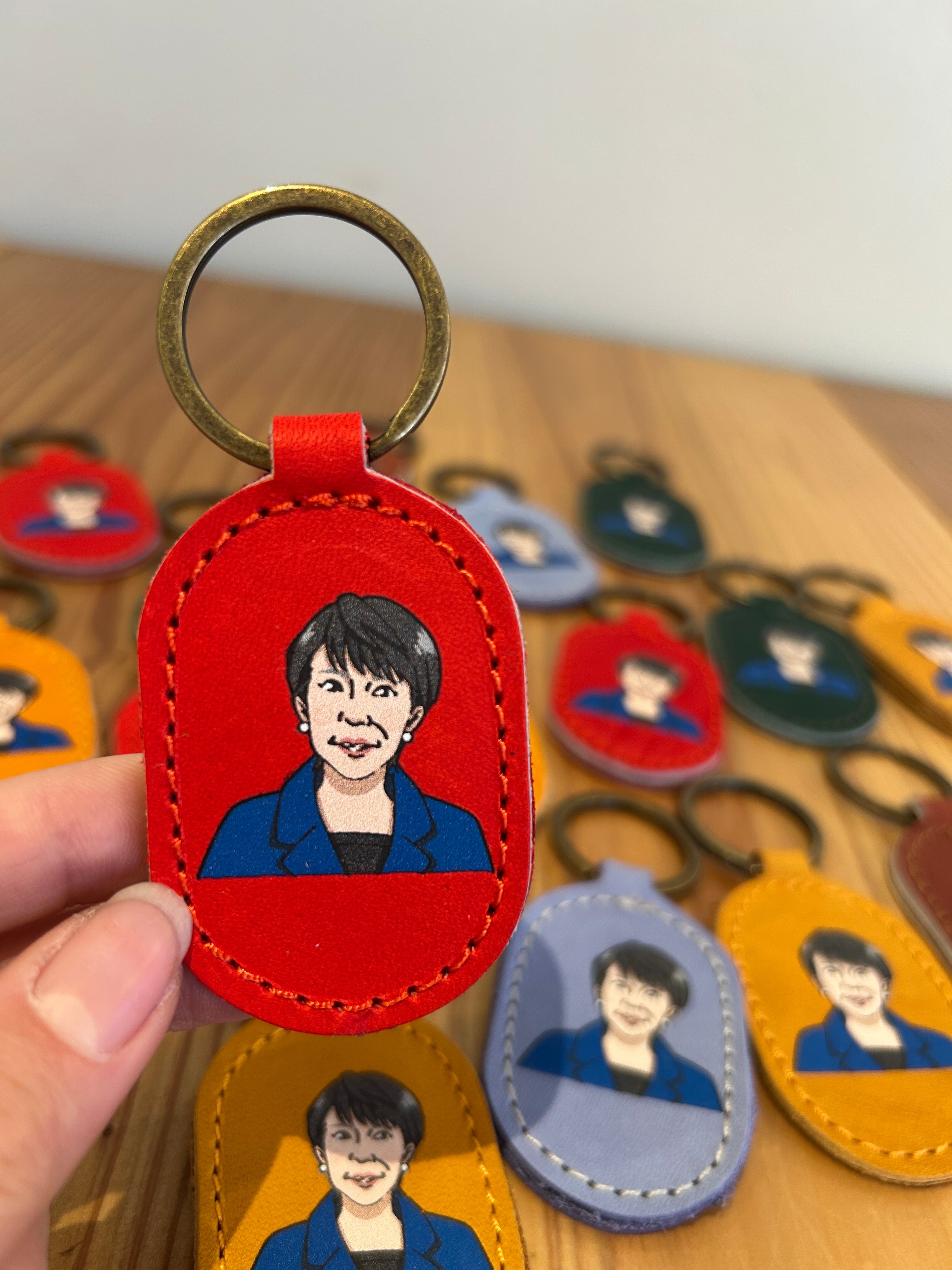 奈良県出身である高市早苗内閣総理大臣のイラストをもとに仕立てた革製キーリング。